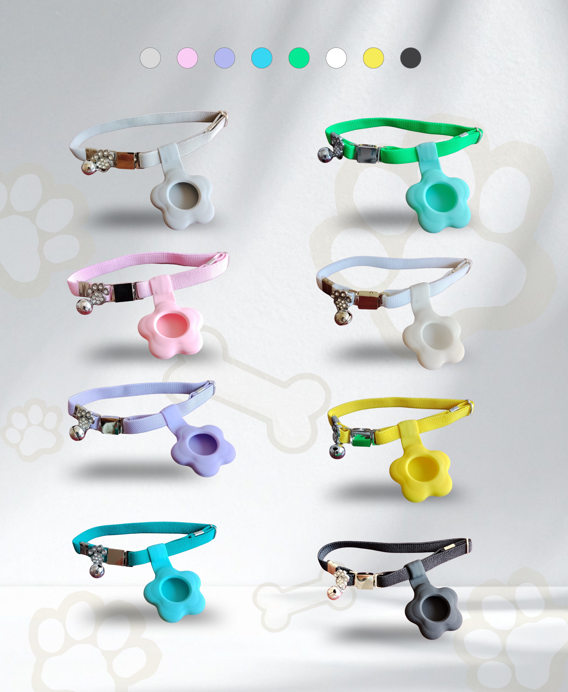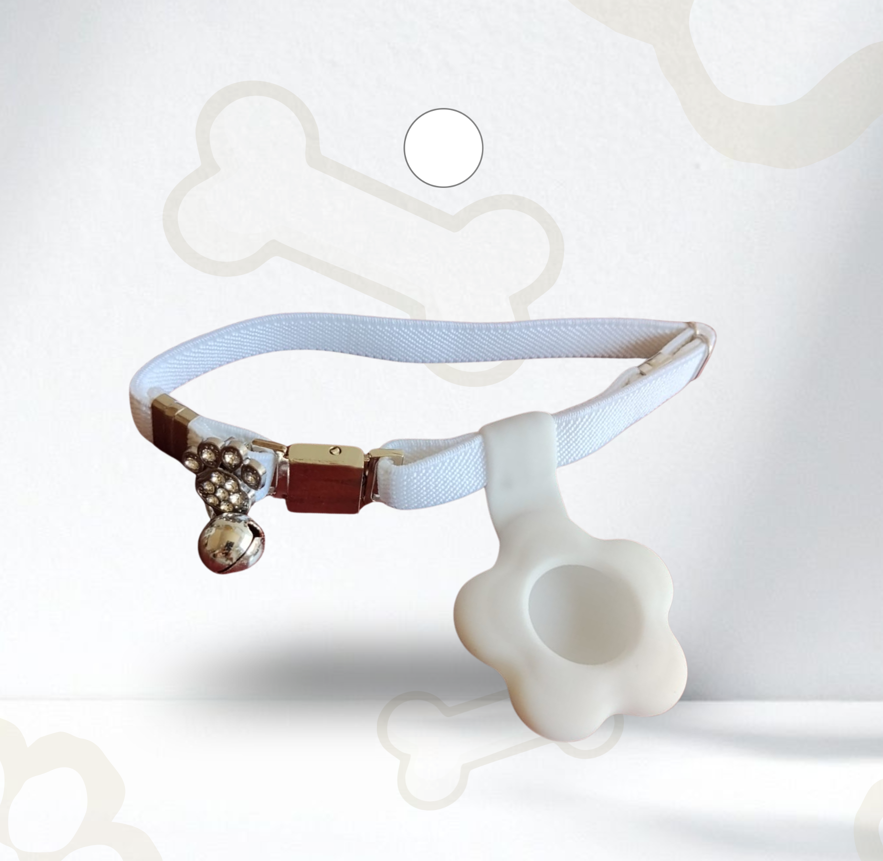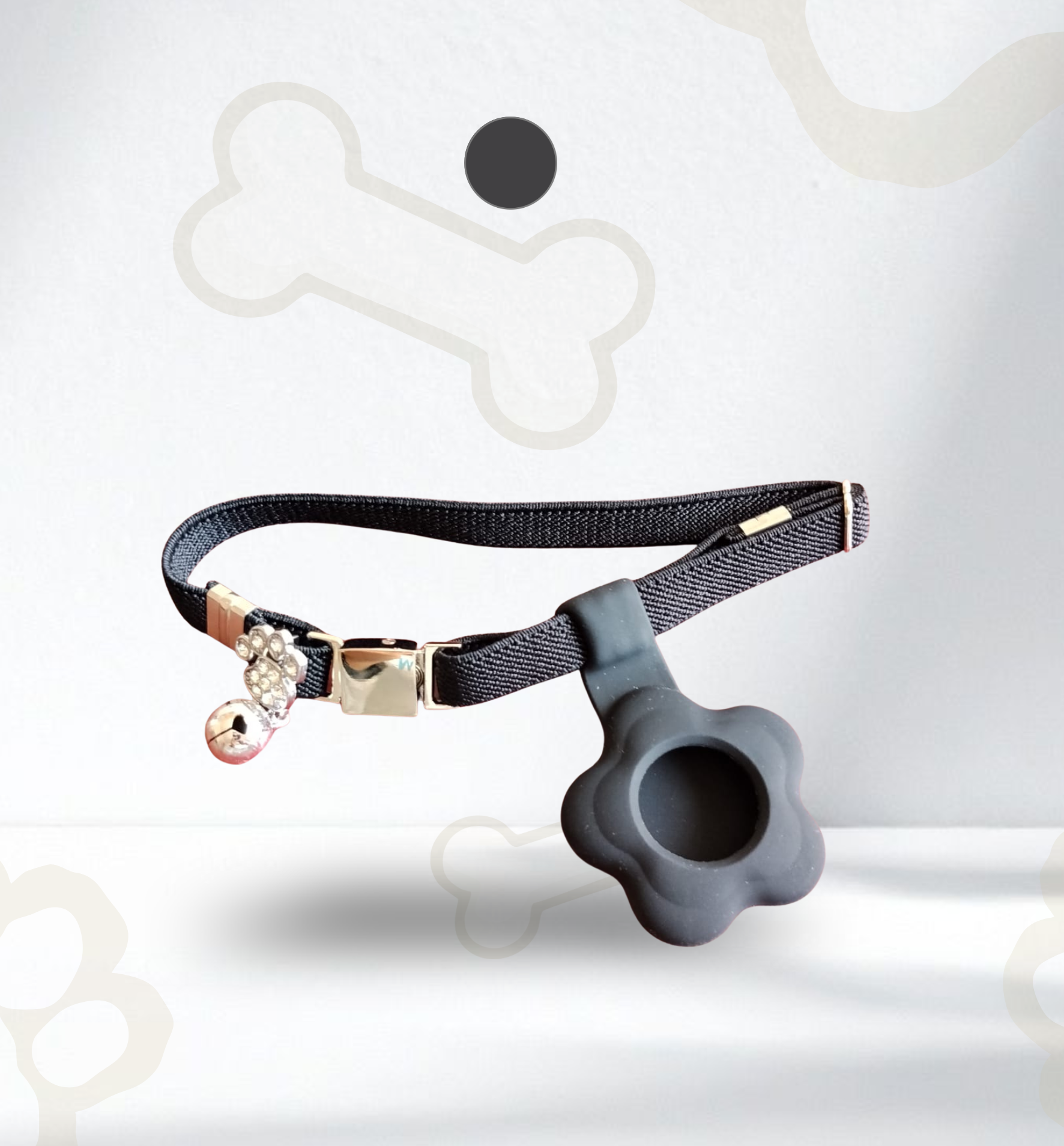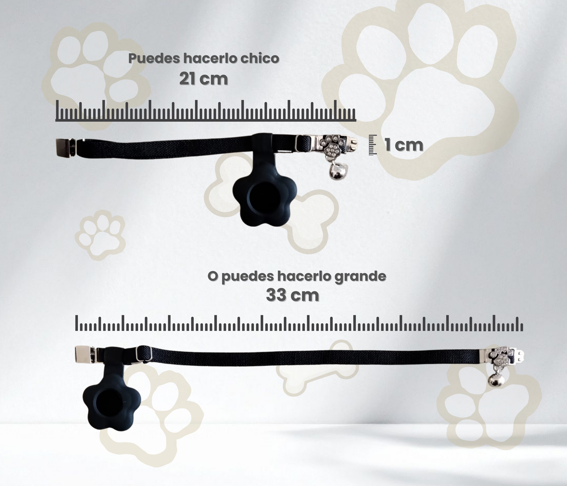 Collar elástico y ajustable para perros y gatos, cuenta con una funda de silicona para colocar un tag (el tag no está incluido) y seguir la ubicación de tu compañero en cualquier momento, tambien tiene un colgante de huellita con un cascabel y una pequeña placa que se puede personalizar con un grabado láser del nombre que tú desees.
