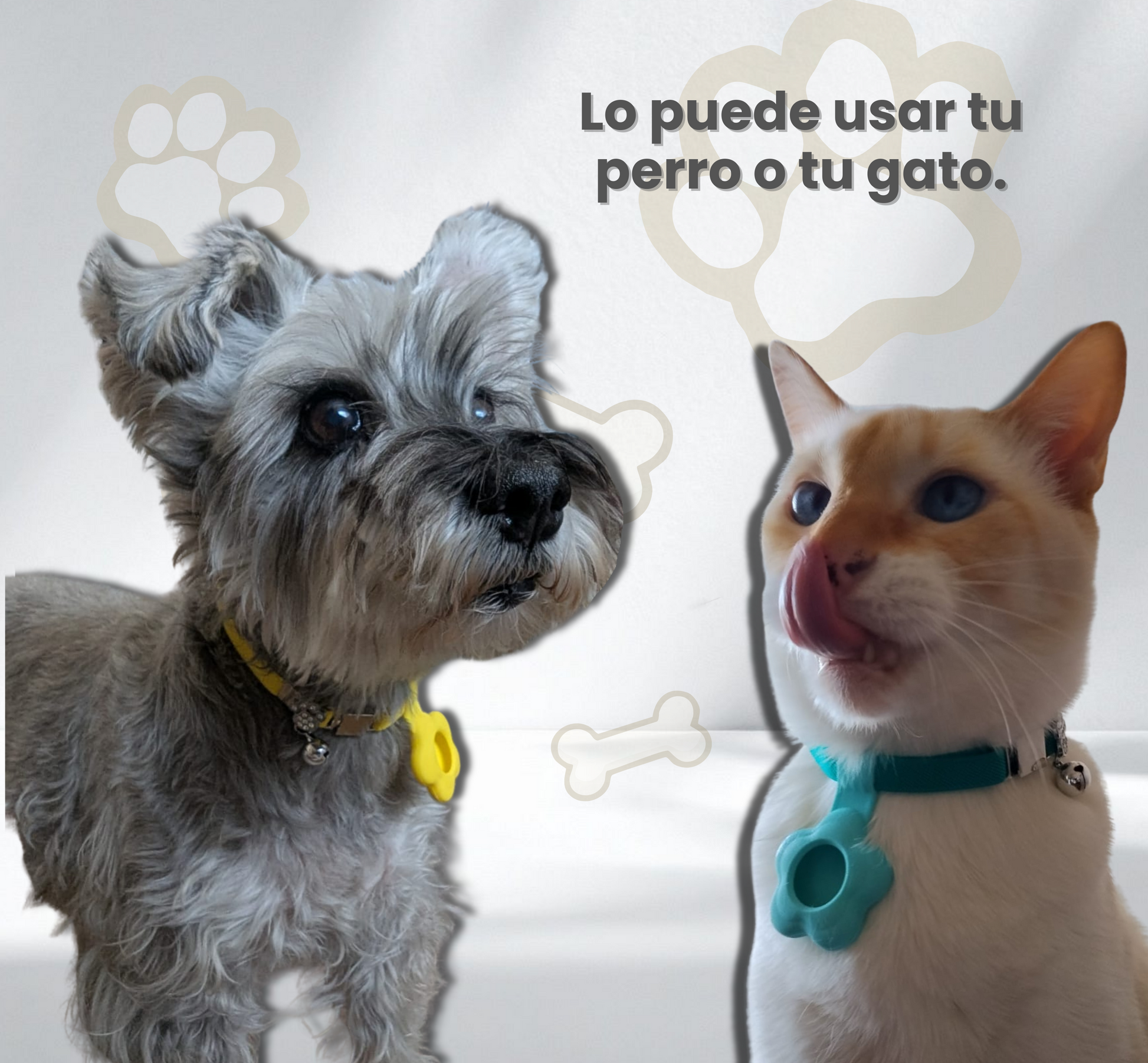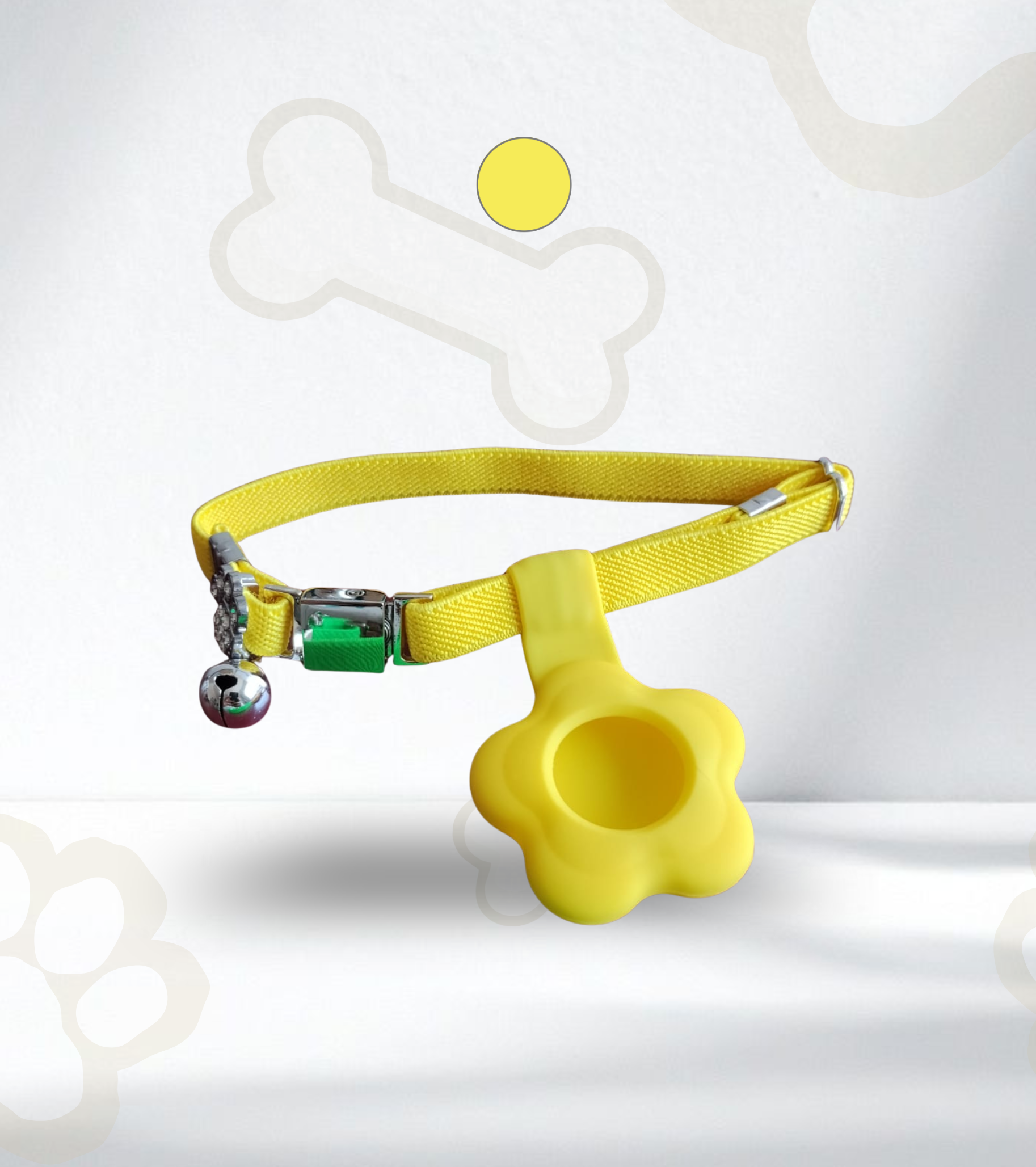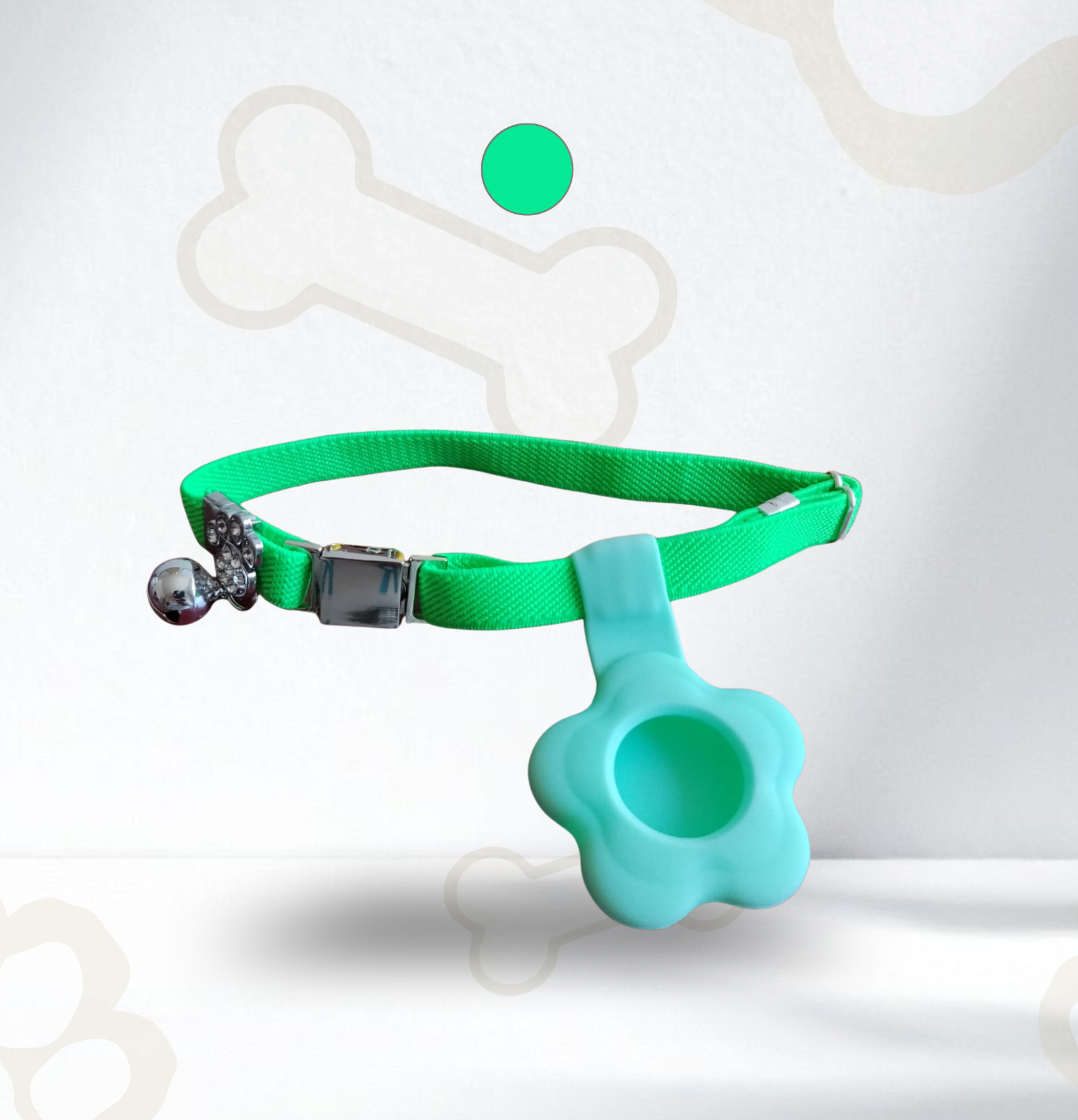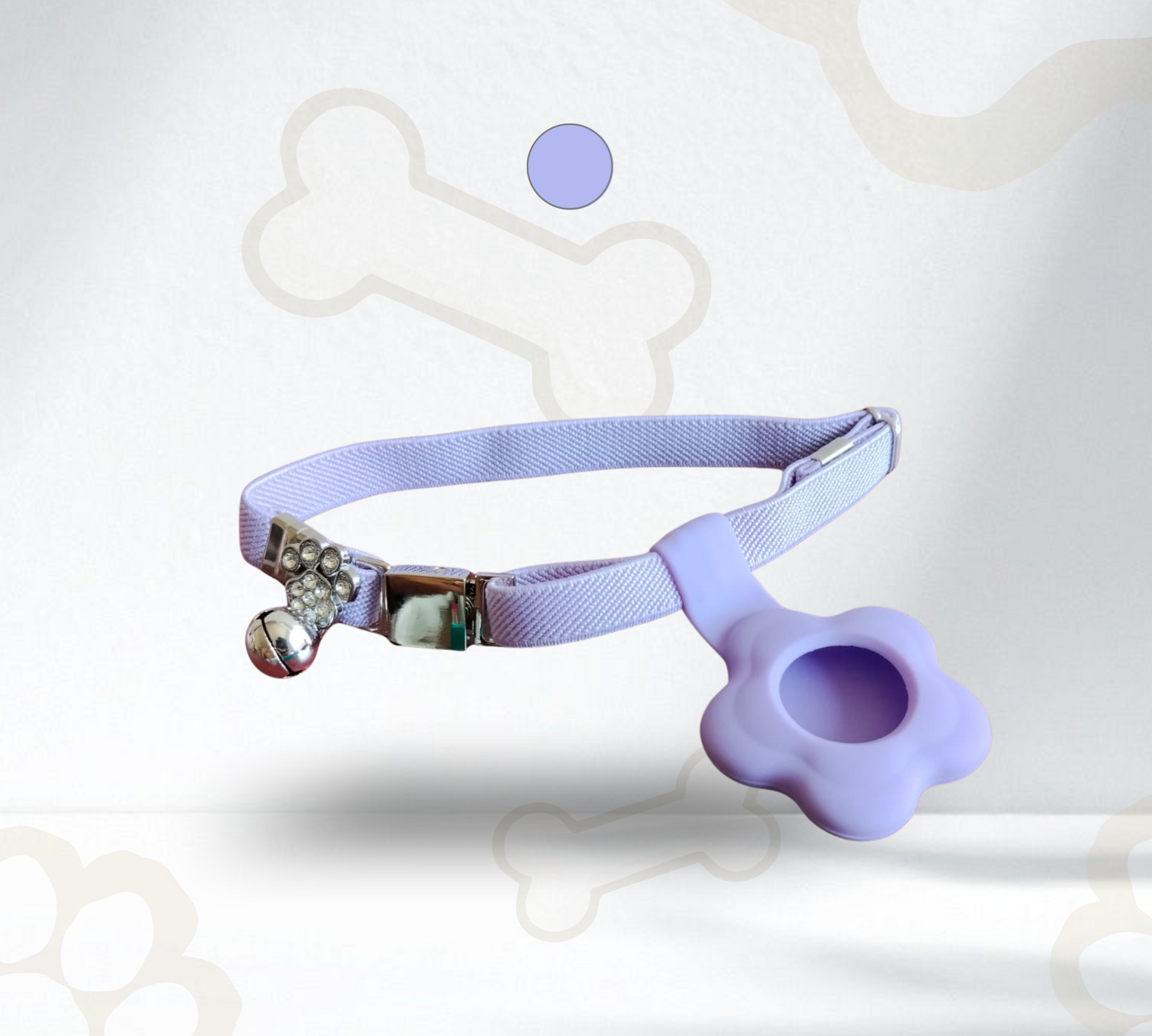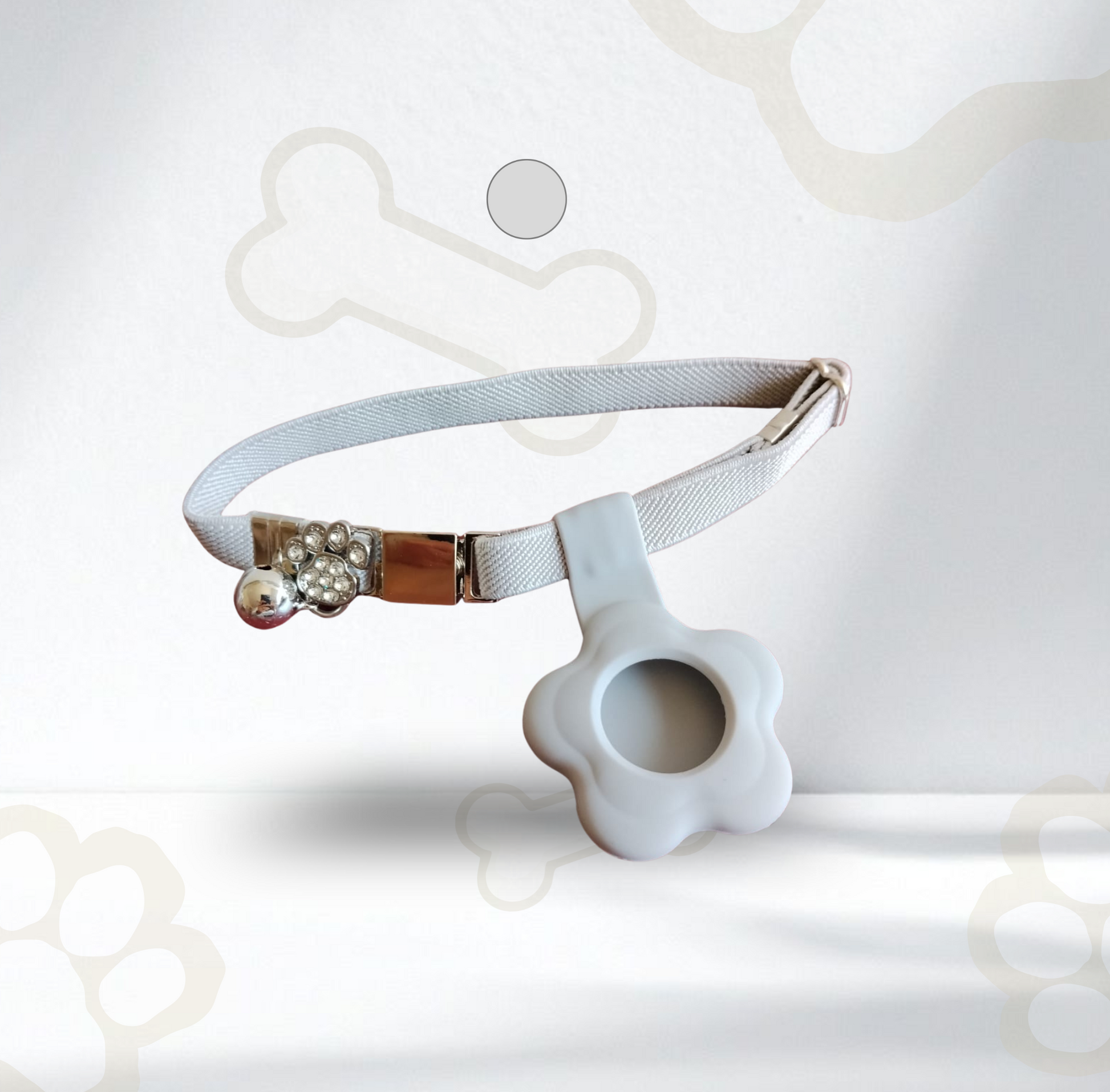 Collar elástico y ajustable para perros y gatos, cuenta con una funda de silicona para colocar un tag (el tag no está incluido) y seguir la ubicación de tu compañero en cualquier momento, tambien tiene un colgante de huellita con un cascabel y una pequeña placa que se puede personalizar con un grabado láser del nombre que tú desees.